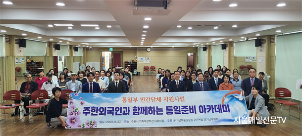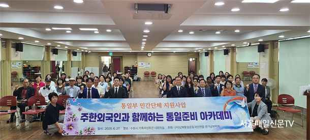 ±è¼­Áß ±âÀÚ / (»ç)³²ºÏÅëÀϿ±¹¹Î¿¬ÇÕ °æ±âµµÈ¸´Â 2025³â 6¿ù 27ÀÏ(¸ñ) ¿ÀÈÄ 2½Ã, ¼ö¿ø¿©¼ºÈ¸°ü 3Ãþ ´ë°­´ç¿¡¼­ ¡®ÁÖÇÑ ¿Ü±¹Àΰú ÇÔ²²ÇÏ´Â ÅëÀÏÁغñ ¾ÆÄ«µ¥¹Ì¡¯¸¦ 80¿© ¸íÀÌ Âü¼®ÇÑ °¡¿îµ¥ °³ÃÖÇÏ¿´´Ù. À̹ø Çà»ç´Â ÅëÀϺΠ¹Î°£´Üü Áö¿ø»ç¾÷ÀÇ ¸ñÀûÀ¸·Î ÁøÇàµÇ¾úÀ¸¸ç ´Ù¹®È­ »çȸ·ÎÀÇ ´ëÀüȯ±â¸¦ ¸ÂÀÌÇÑ ´ëÇѹα¹ »çȸÀÇ ´Ù¹®È­°¡Á¤°ú ¹Ì·¡ ¼¼´ëµé¿¡°Ô ÅëÀÏ¿¡ ´ëÇÑ ±¹Á¦Àû °ø°¨´ë¸¦ Çü¼ºÇÏ°í ¼ÒÅëÀ» ÅëÇØ ÅëÀÏÁغñÀÇ ¹æÇâÀ» »õ·Ó°Ô ¸ð»öÇϰíÀÚ ¸¶·ÃµÇ¾ú´Ù.